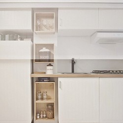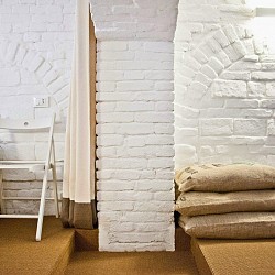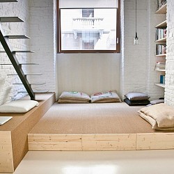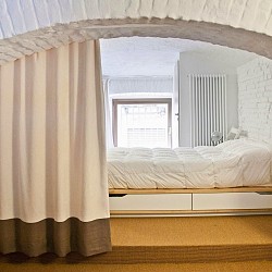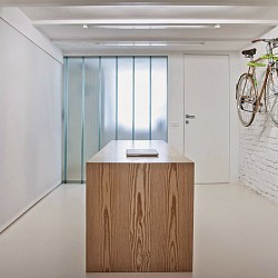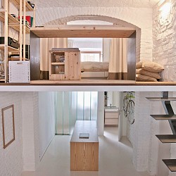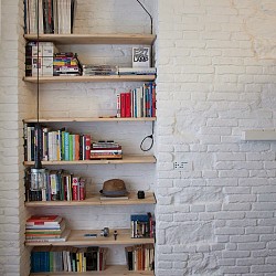 Пространство довольно узкое, но с высокими потолками — это стало отправной точкой проекта. Решено было добавить антресоль, чтобы воспользоваться его высотой. Благодаря такой планировке получилось максимально организовать жилое пространство. На первом этаже разместились гостиная, студия, кухня и ванная комната, а на антресоли спальная зона и дополнительное рабочее место с металлической лестницей ведущей в гостиную. Решающей для архитекторов была концепция лофт пространства многофункционального использования. В спальне висят белые плотные шторы, для создания полностью приватного пространства, когда это необходимо. Открытая кирпичная кладка, окрашенная в белый цвет, и два больших окна напротив друг друга, отличное решение для максимального использования естественного света. Вся мебель была выполнена на заказ и спроектирована таким образом, чтобы занимать минимум свободного пространства. Также для экономии места велосипед повесили на стену.